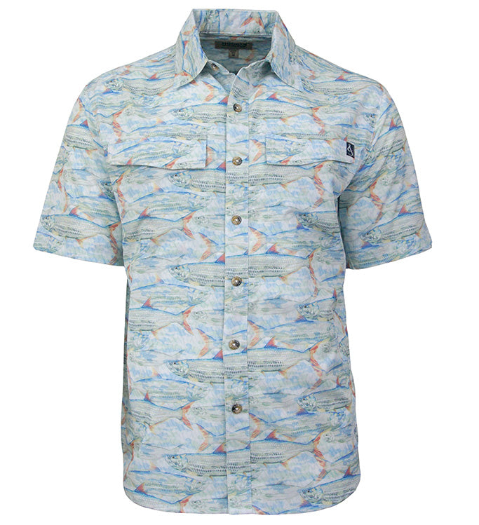 Hook into comfort with the Hook & Tackle Tarponmania short sleeve fishing shirt—made for anglers who live for the thrill of the fight. Decked out in a bold tarpon print, this shirt brings serious style to serious fishing. Its 360° stretch fabric moves like you do, whether you're casting, cranking, or cracking open a cold one. Lightweight, breathable, and sun-smart, it blocks 97%+ of harmful UV rays so you can stay out longer without the lobster look. Rear air vents keep the breeze flowing and the heat fleeing. With secure flap pockets, it’s got everything but the fish itself.