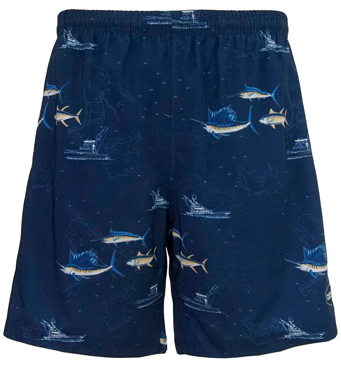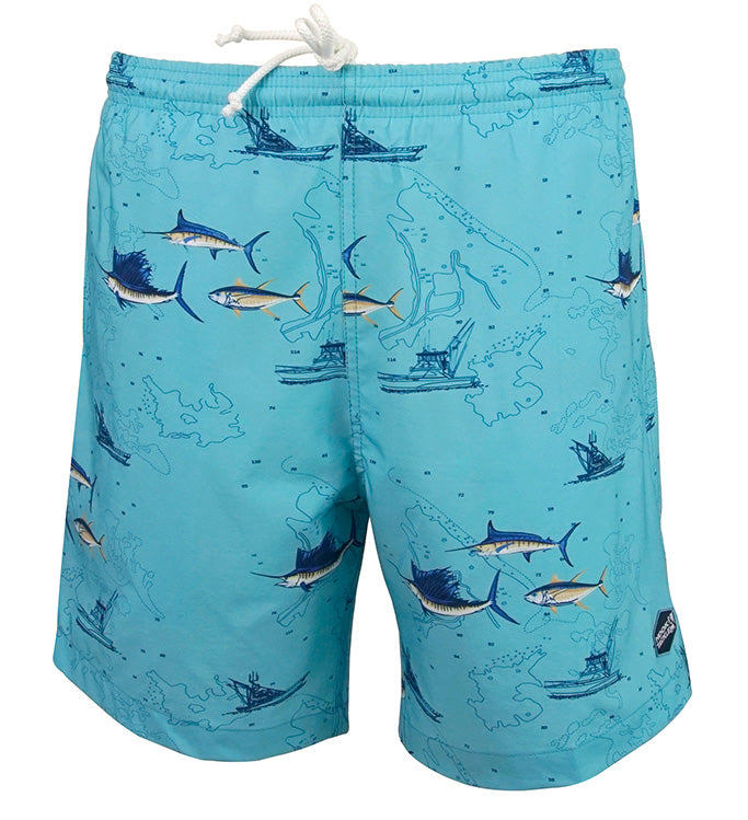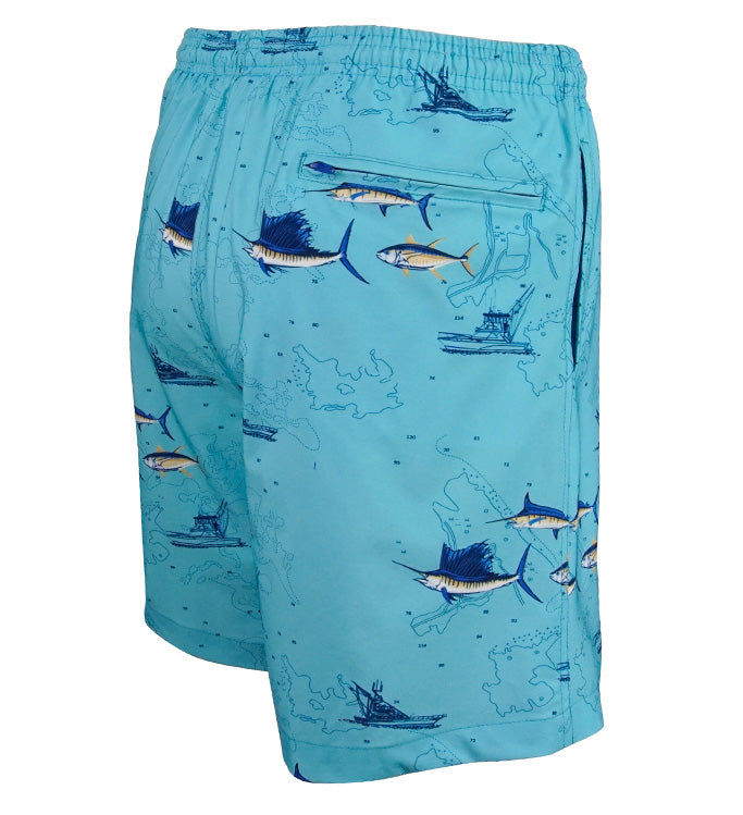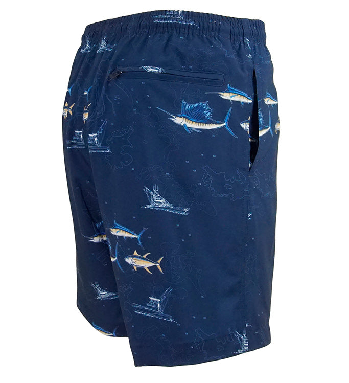 But it's not just about functionality – the "Marine Charts" print adds a touch of nautical charm to your fishing ensemble, featuring intricate graphics inspired by navigation charts. Whether you're exploring new fishing grounds or revisiting old favorites, these trunks are sure to make a statement wherever your fishing adventures take you.